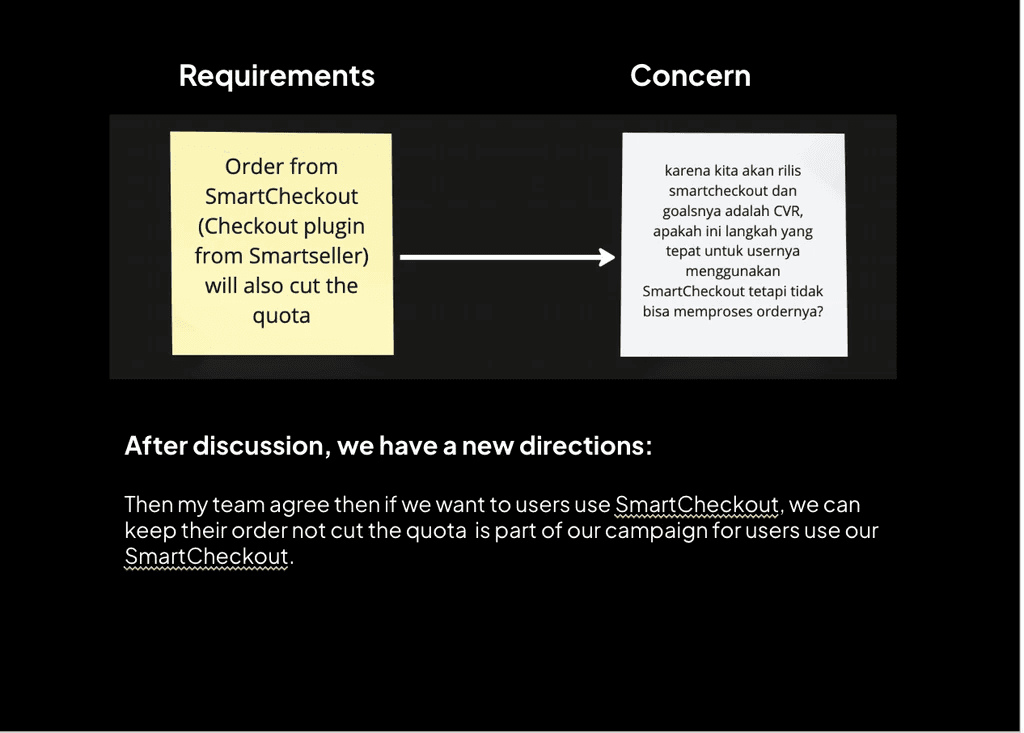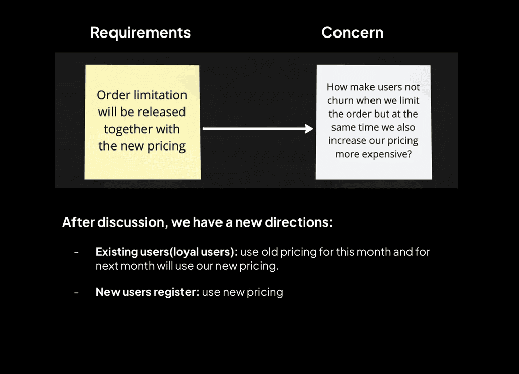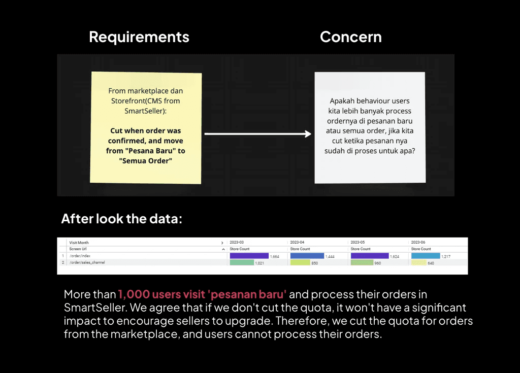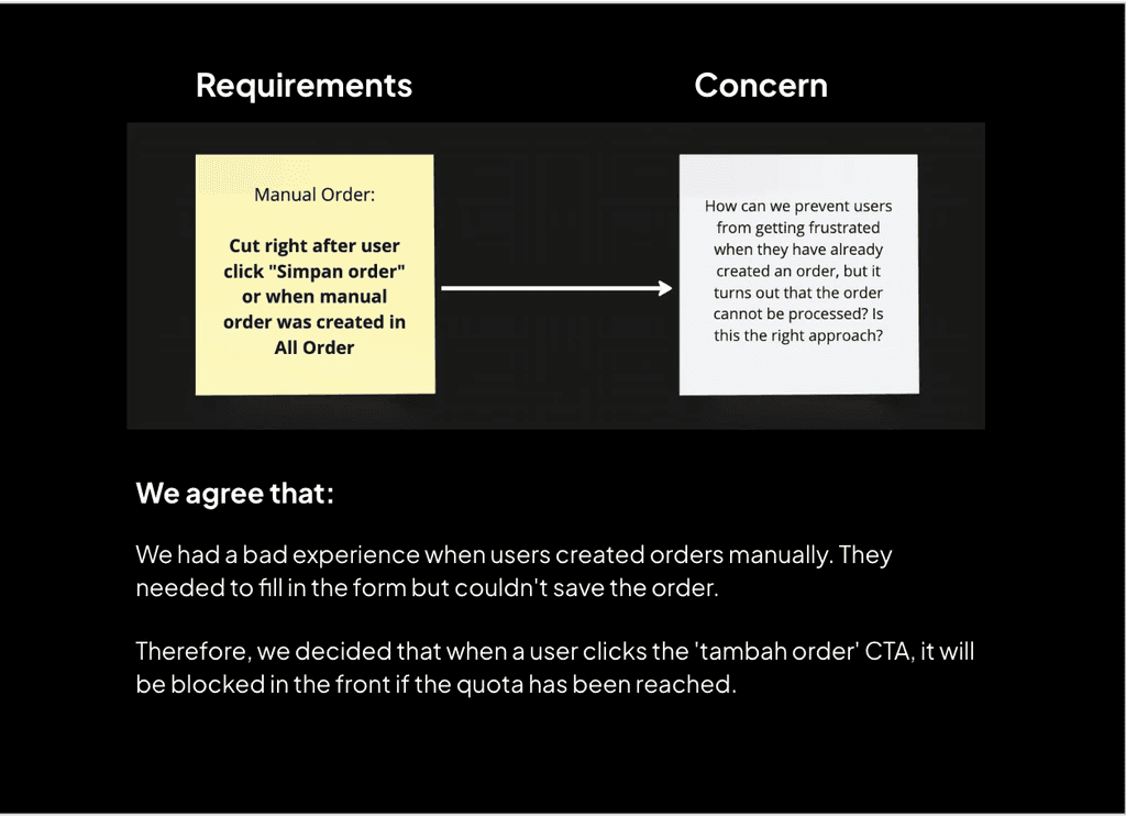 However, we still have concerns about several requirements example: why we cut the order` only from marketplace? our concern: we have the data many users process their order from Marketplace instead of manual oder? we make sure that we have the right approach based on data, we put the miro our concern then discuss with stakeholders after that.